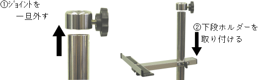 ●スライドポールの下段にホルダーを取り付ける際は下記の参考写真の様に一度スライドポールのジョイント部分を外した状態で、ホルダーをあらかじめ通し再びポールのジョイント部分を取り付けてます。 |